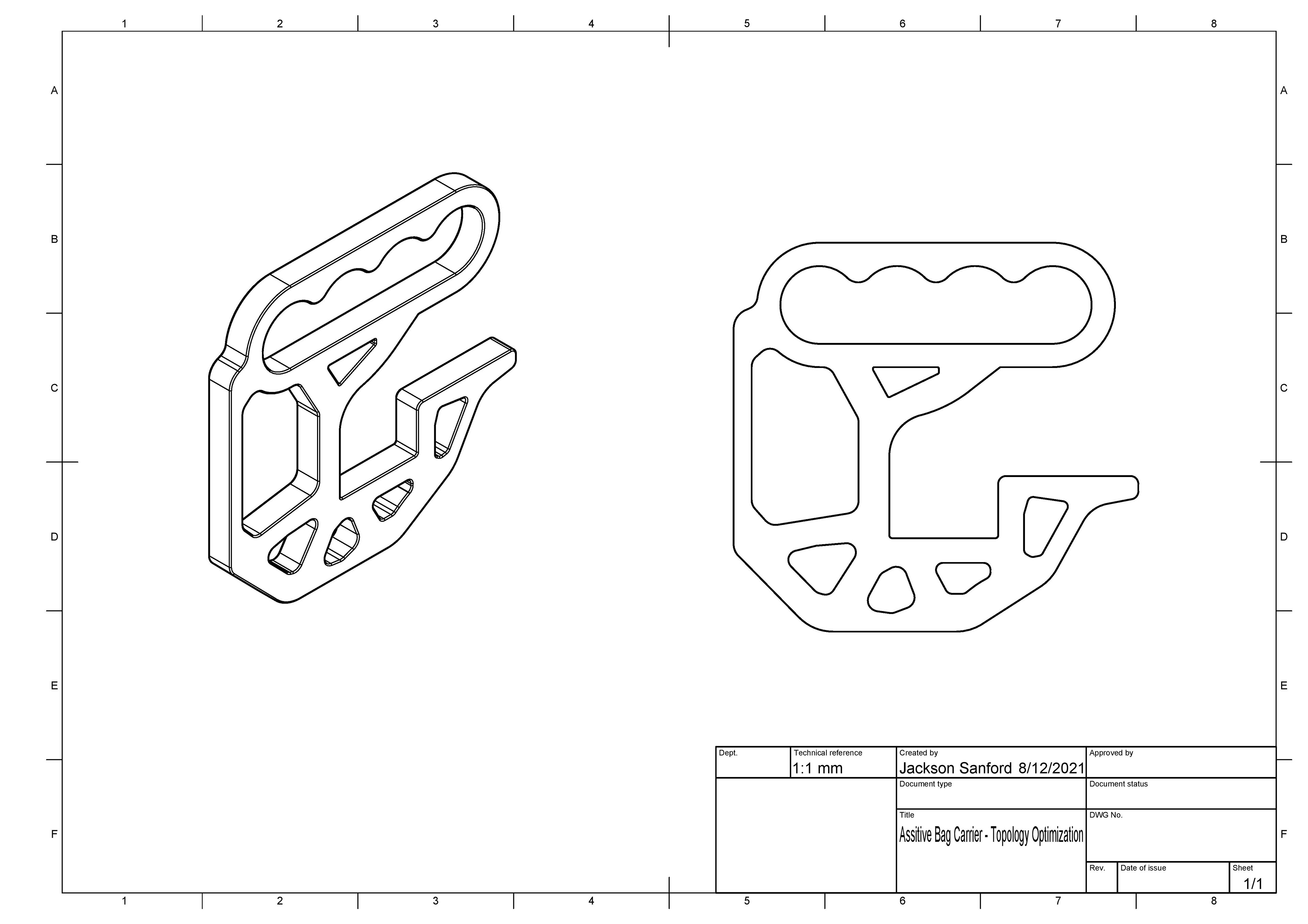 This project shows two versions of an assistive bag carrier. This item may be used by a person who struggles with maintaining a consistent grip to carry groceries. The project includes an optimized version and a version that has been generated for optimum strength to weight ratio.